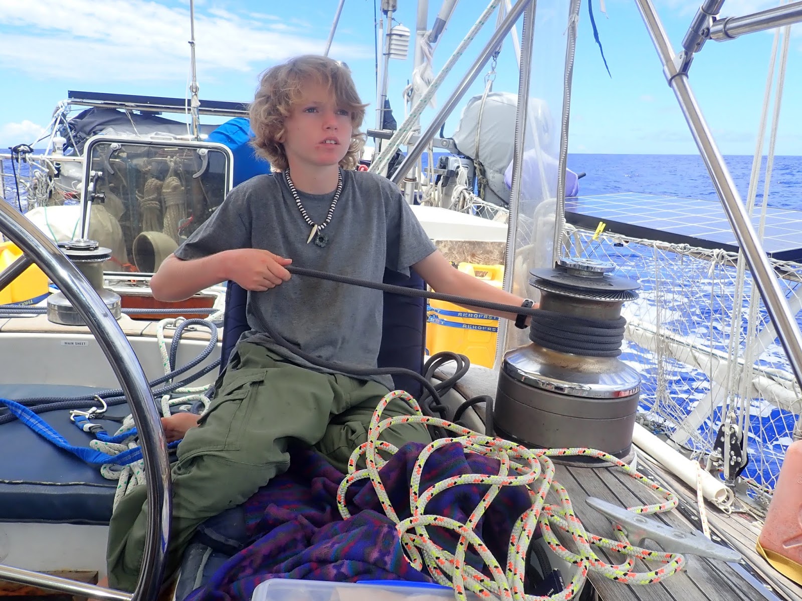We had genoa winds in the morning, spinnaker winds in the afternoon (from the SE and then from the SW), and no wind tonight. We are crossing an area of high pressure that we are hoping to get through in the next day or so before it enlarges and becomes even harder to pass across. In our (ie Max's, to give credit where it is due) analysis of all the historical data, this seems to be an anomaly year; we expected a period of calm, but not this early or this wide. I am hoping that we will somehow gather great speed once the wind fills in, and make up some time on the remainder of the trip. As ever, we can only sail the conditions we have on the day that we have them. The seas and the winds don't care much for our plans!